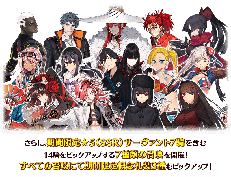 さらに、期間限定★5(SSR)サーヴァント7騎を含む14騎と期間限定概念礼装3種をピックアップする7種類の召喚を期間毎に切り替わりで開催いたします!