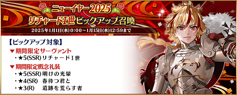 2025年を迎えたことを記念して、新登場の期間限定サーヴァント「★5(SSR)リチャードⅠ世」と期間限定概念礼装3種をピックアップ!