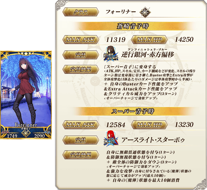 「★5(SSR)蒼崎青子」は宝具を使用することで、「スーパー青子」に変身して以下の内容が変化します。