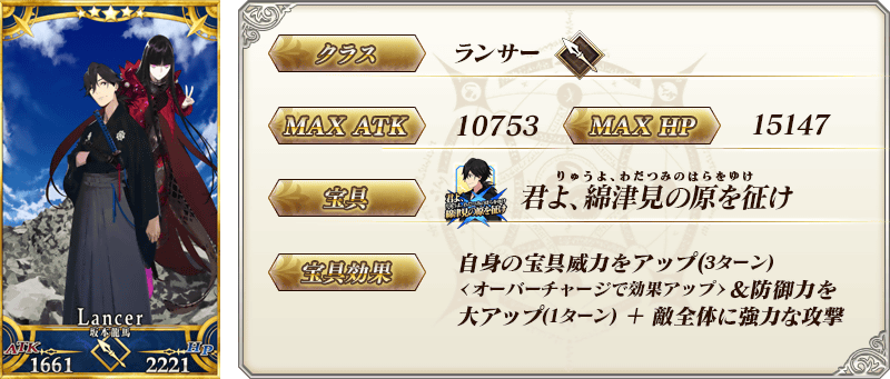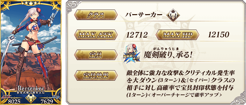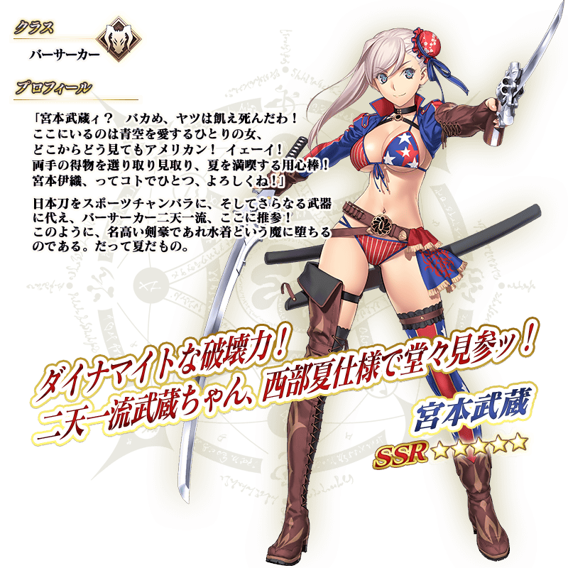 ※上記の「★5(SSR)宮本武蔵(バーサーカー)」のイラストとセイントグラフは霊基再臨第2段階のものです。 ※「★5(SSR)宮本武蔵(バーサーカー)」の宝具は再臨段階によって演出が変化いたします。
