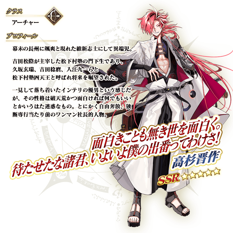 ※上記の「★5(SSR)高杉晋作」のイラストとセイントグラフは霊基再臨第2段階のものです。