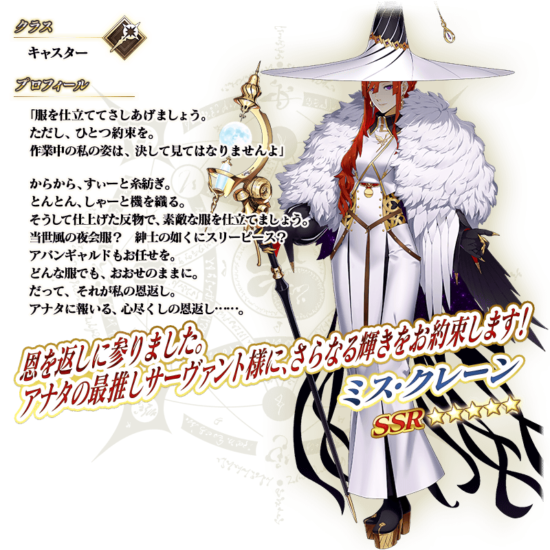 ※上記の「★5(SSR)ミス・クレーン」のイラストとセイントグラフは霊基再臨第2段階のものです。
