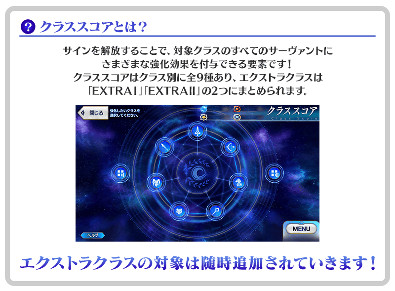 「EXTRAⅠ」はエクストラクラスの「ルーラー、アヴェンジャー、ムーンキャンサー、シールダー」の4種を対象としたクラススコアとなり、ほかのエクストラクラスのクラススコアは別の条件を達成することで追加されます。