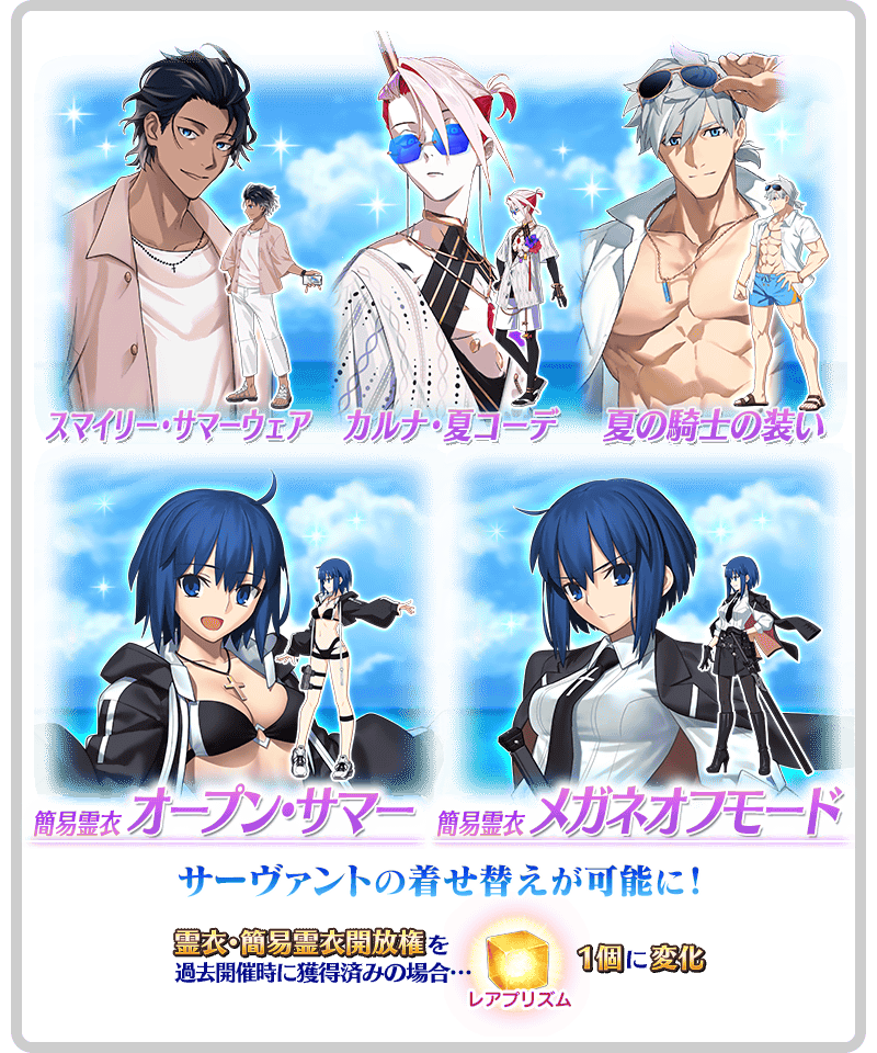 ※2024年に開催された期間限定イベント「BBプレゼンツ☆セレブサマー・エクスペリエンス! ~逆襲のドバイ~」で霊衣・簡易霊衣開放権を獲得していない場合のみ獲得可能です。すでに同じ霊衣・簡易霊衣開放権を獲得している場合、代わりにレアプリズムを獲得できます。