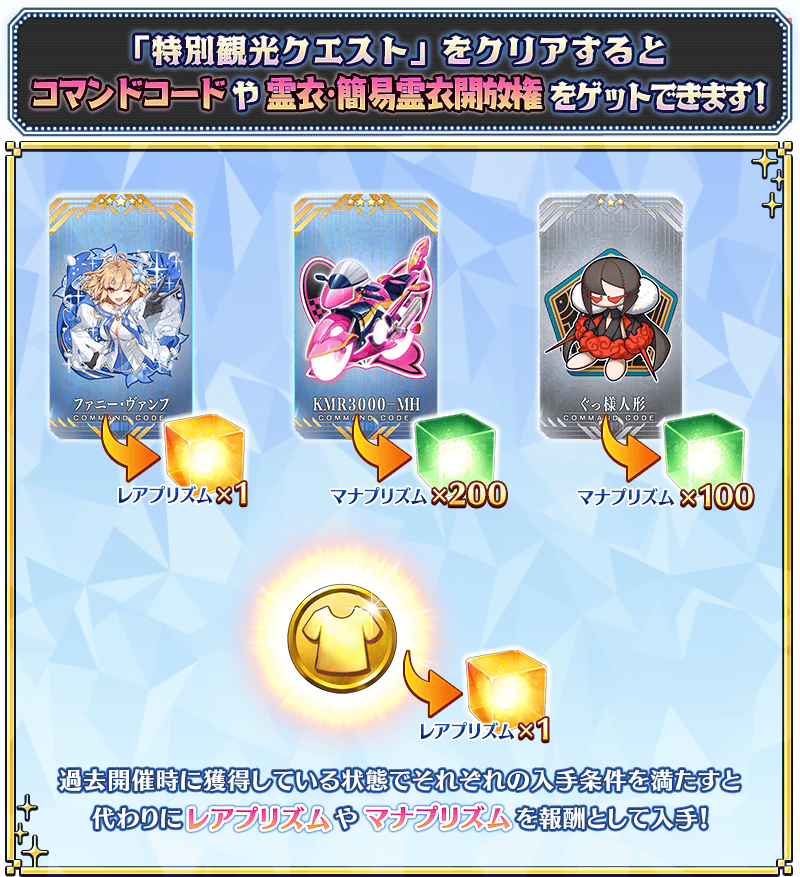 ※2024年に開催された期間限定イベント「BBプレゼンツ☆セレブサマー・エクスペリエンス! ~逆襲のドバイ~」でコマンドコードを獲得していない場合のみ獲得可能です。すでに同じコマンドコードを獲得している場合、代わりにレアプリズムまたはマナプリズムを獲得できます。 ※期間限定イベント「BBプレゼンツ☆セレブサマー・エクスペリエンス! ~逆襲のドバイ~」で獲得済みの各コマンドコードを霊基変還(売却)で失っている場合でも、メイン・インタールード「BBプレゼンツ☆セレブサマー・エクスペリエンス! ~逆襲のドバイ~」での報酬はレアプリズムやマナプリズムに変化します。