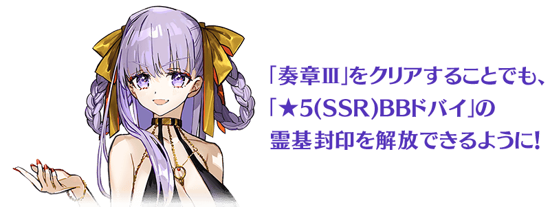 2024年10月31日(木) 13:00以降は「★5(SSR)BBドバイ」の霊基封印を解放するためには、「幕間の物語」に登録されている「★5(SSR)BBドバイ」の『霊基解放クエスト』をクリアする必要がありましたが、「奏章Ⅲ」の開放以降は、「奏章Ⅲ」をクリアすることでも霊基封印を解放できるようになりました。
