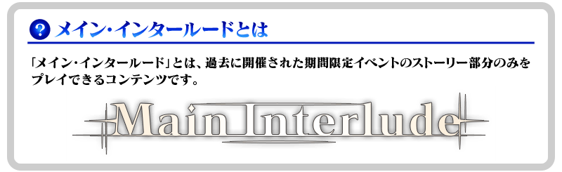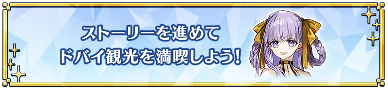 ※下記の期間限定イベントをクリア済みの場合でもプレイすることができます。 ・期間限定イベント「BBプレゼンツ☆セレブサマー・エクスペリエンス! ~逆襲のドバイ~」 ※ストーリーは期間限定イベント「BBプレゼンツ☆セレブサマー・エクスペリエンス! ~逆襲のドバイ~」と同じ内容になりますが、遊び方、コマンドコードや霊衣・簡易霊衣の報酬などはメイン・インタールード化にともない、一部を調整しております。 ※過去に開催された期間限定イベント「BBプレゼンツ☆セレブサマー・エクスペリエンス! ~逆襲のドバイ~」で「聖杯」を獲得している場合、メイン・インタールード「BBプレゼンツ☆セレブサマー・エクスペリエンス! ~逆襲のドバイ~」では「聖杯」の代わりに「伝承結晶」がクリア報酬となります。 ※過去開催時に「★5(SSR)カルナ」「★4(SR)パーシヴァル」「★1(C)バーソロミュー・ロバーツ」の霊衣開放権、「★5(SSR)謎の代行者C.I.E.L」の簡易霊衣開放権を獲得している場合、代わりにレアプリズムを獲得できます。 ※過去開催時に「コマンドコード」を獲得している場合、メイン・インタールード「BBプレゼンツ☆セレブサマー・エクスペリエンス! ~逆襲のドバイ~」の対象クエストで「コマンドコード」に代わり、レアプリズムまたはマナプリズムを獲得できます。 ※一部アイテムを獲得することはできません。 ※クエストをクリアした際に獲得できる戦利品およびクエストクリア報酬は過去に開催された期間限定イベント「BBプレゼンツ☆セレブサマー・エクスペリエンス! ~逆襲のドバイ~」の報酬とは異なります。 ※フリークエストやチャレンジクエストなど一部のクエストはプレイできません。 ※適用されるサポート編成は「通常クエスト」に設定されているものとなります。