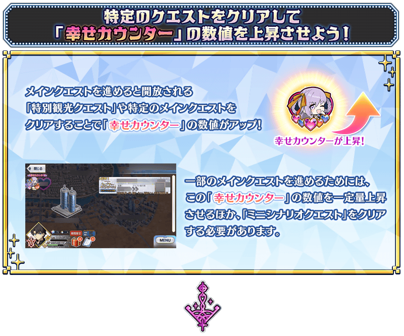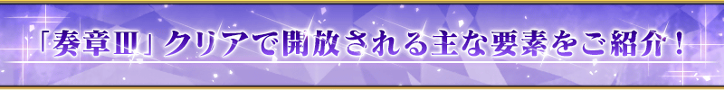 ※2024年に期間限定で開放されていた「奏章Ⅲ」をクリアしている場合、開放された「奏章Ⅲ」のメインクエストはすべてクリア済みかつクリア報酬も受け取り済みの状態となります。「奏章Ⅲ」のストーリーを確認したい場合は、マイルームのマテリアルからお楽しみいただけます。 ※過去に開放された際に「奏章Ⅲ」を途中まで攻略していた場合、開放後は攻略途中からの再開となります。 ※「奏章Ⅲ」は、メイン・インタールード「BBプレゼンツ☆セレブサマー・エクスペリエンス! ~逆襲のドバイ~」から続くストーリーとなりますが、未クリアの場合でもプレイすることができます。 ※「奏章Ⅲ」開始時に、メイン・インタールード「BBプレゼンツ☆セレブサマー・エクスペリエンス! ~逆襲のドバイ~」のストーリーのあらすじを確認することができます。 ※「奏章Ⅲ」の物語はメインクエスト「奏章Ⅰ」「奏章Ⅱ」の内容に関するネタバレを一部含みます。メインクエスト「奏章Ⅰ」「奏章Ⅱ」を未クリアでプレイされる方につきましては、ネタバレを一部含むことをご了承の上、プレイしていただきますようお願いいたします。