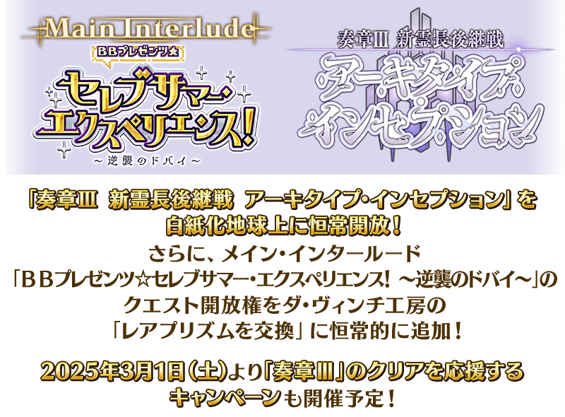 3月1日(土)に予定している『「奏章Ⅲ」クリア応援キャンペーン』に先駆けて、「奏章Ⅲ 新霊長後継戦 アーキタイプ・インセプション」の恒常化とメイン・インタールード「BBプレゼンツ☆セレブサマー・エクスペリエンス!」を先行リリースいたします!