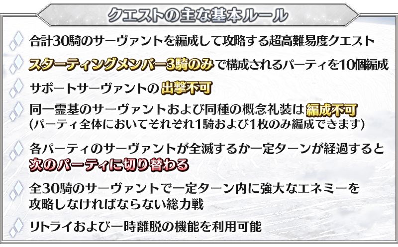 ※再挑戦する際のクエストには、アドベンチャーパートおよびクエストクリア報酬、戦利品、マスターEXP、魔術礼装EXP、絆ポイントの獲得はございません。 ※該当クエストの再挑戦中にバトルから一時離脱していた場合、再挑戦期間を過ぎると一時離脱したバトルの状況は消滅します。