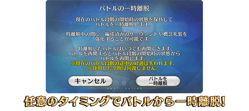※「一時離脱」を選択したクエストのバトルの進行状況は、該当クエストをクリアするまで維持されます。 ※一時離脱したバトルを再開する際にAPは消費いたしません。 ※再開するバトルより前の進行済みのバトル段階で編成していたサーヴァントはバトル再開時に編成し直すことはできません。