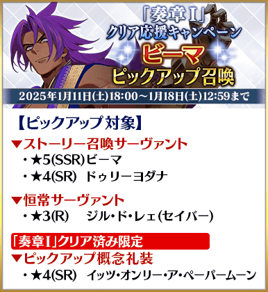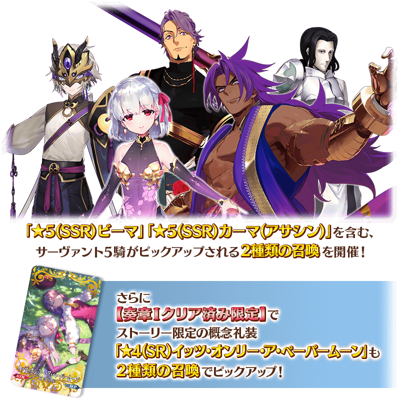 「奏章Ⅰ」に関連するサーヴァントの中から「★5(SSR)ビーマ」「★5(SSR)カーマ(アサシン)」を含む5騎のサーヴァントをピックアップする2種類の召喚を開催いたします!