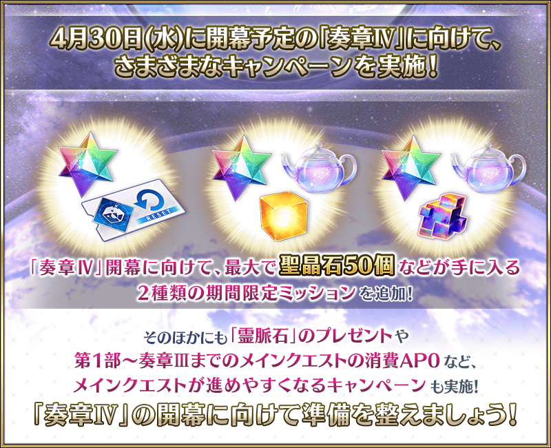 すべてのミッションをクリアすると、星見のティーポット10個、レアプリズム1個、聖晶石40個に加え、今回は特別報酬としてピュアプリズム交換在庫リセット券3枚もゲットできます!
