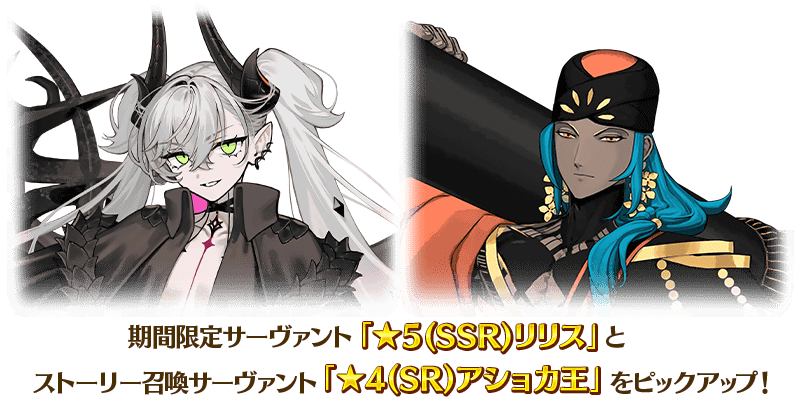 「奏章Ⅳ 人類裁決法廷 トリニティ・メタトロニオス」の開幕を記念して、新登場の期間限定サーヴァント「★5(SSR)リリス」とストーリー召喚サーヴァント「★4(SR)アショカ王」をピックアップ!