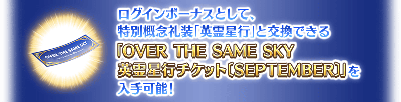 ※本ログインボーナスで獲得できる「OVER THE SAME SKY 英霊星行チケット〔SEPTEMBER〕」で交換可能な「英霊星行」は、東海・北陸ブロックのもののみとなります。 ※2019年1月1日(火) 0:00以降に新たに配信されるメインストーリー、期間限定イベント、一部クエスト、キャンペーンおよび召喚では、真名隠し対象サーヴァントの真名が表示されます。