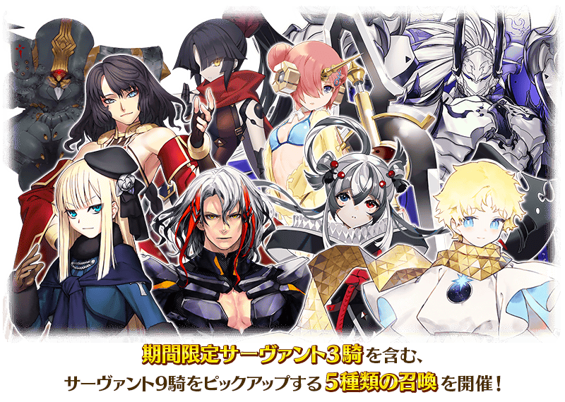 本召喚では、各召喚にてピックアップされている★5(SSR)サーヴァントのみが「確定召喚」による召喚の対象となります。