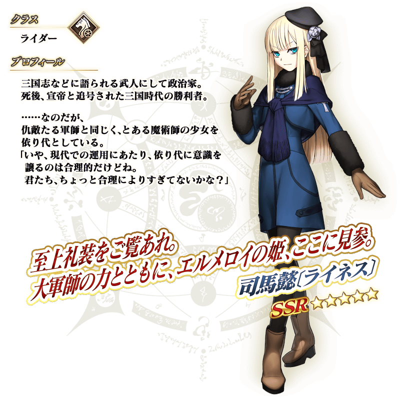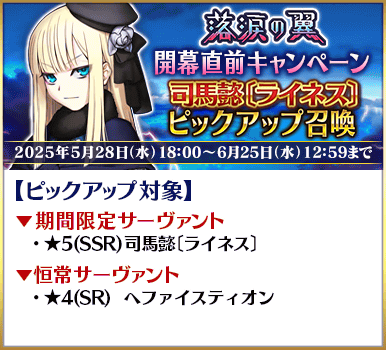 期間限定イベント「落涙の翼」で活躍する期間限定サーヴァント「★5(SSR)司馬懿〔ライネス〕」と恒常サーヴァント「★5(SSR)オデュッセウス」を含む、9騎のサーヴァントをピックアップする5種類の召喚を開催いたします!