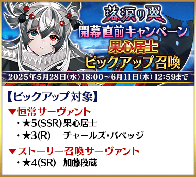・期間限定ピックアップ召喚において、329回以内にピックアップ対象の★5(SSR)サーヴァントが召喚されなかった場合、330回目の召喚をおこなった際にピックアップ対象の★5(SSR)サーヴァントを必ず1騎「確定召喚」できます。