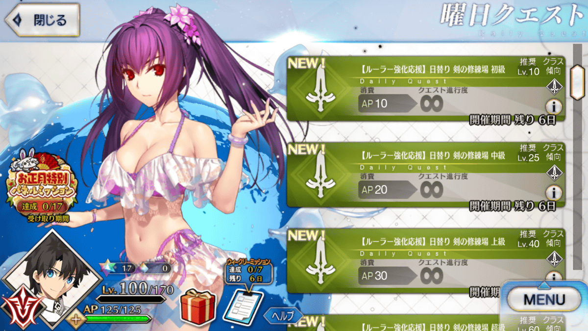 期間限定で、カルデアゲート内に曜日ごとに出現する「修練場」を期間限定で全種開放いたします。
