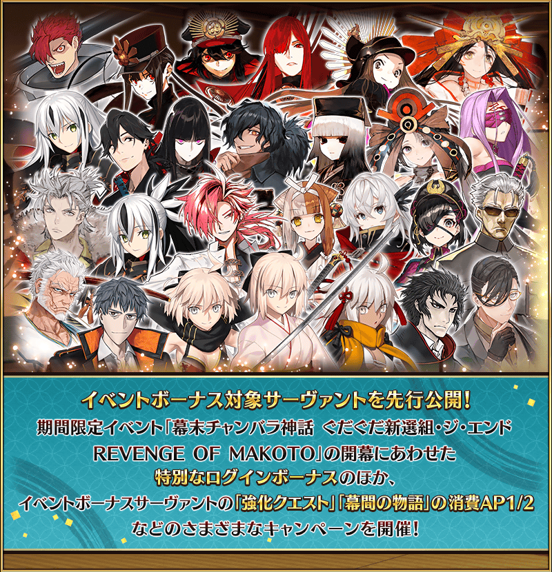 期間限定イベント「幕末チャンバラ神話 ぐだぐだ新選組・ジ・エンド REVENGE OF MAKOTO」の期間中、一部のサーヴァントはイベントクエストにおける「自身の攻撃の威力がアップ」と「絆ポイント獲得量がアップ」のボーナスを得られます!