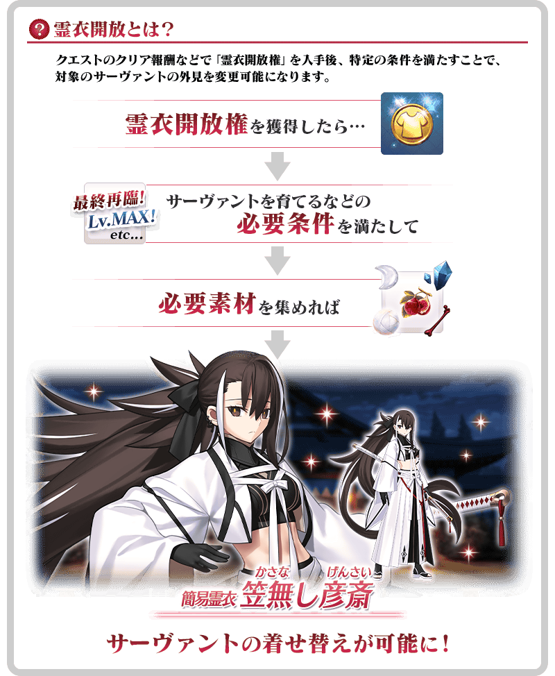 ※対象の霊衣開放権は、期間限定イベント「幕末チャンバラ神話 ぐだぐだ新選組・ジ・エンド REVENGE OF MAKOTO」のイベントアイテム交換期間のみ入手可能です。 ※対象の霊衣開放権の対象サーヴァントを未所持の場合、霊衣開放権の入手はできますが、霊衣開放はおこなえませんのでご注意ください。 ※対象の霊衣は外見のみ変化し、ボイスは変化しない「簡易霊衣」です。