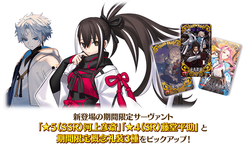 期間限定イベント「幕末チャンバラ神話 ぐだぐだ新選組・ジ・エンド REVENGE OF MAKOTO」の開幕を記念して、新登場の期間限定サーヴァント「★5(SSR)河上彦斎」「★4(SR)藤堂平助」と期間限定概念礼装3種をピックアップ!
