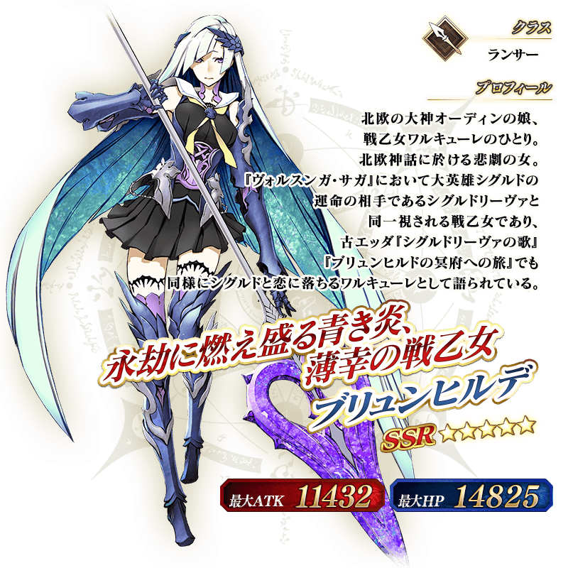 ※上記の「★5(SSR)ブリュンヒルデ(ランサー)」のイラストは霊基再臨第2段階のものです。