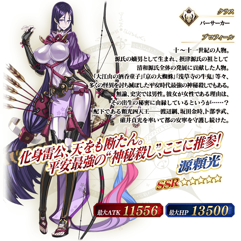 ※上記の「★5(SSR)源頼光(バーサーカー)」のイラストは霊基再臨第2段階のものです。