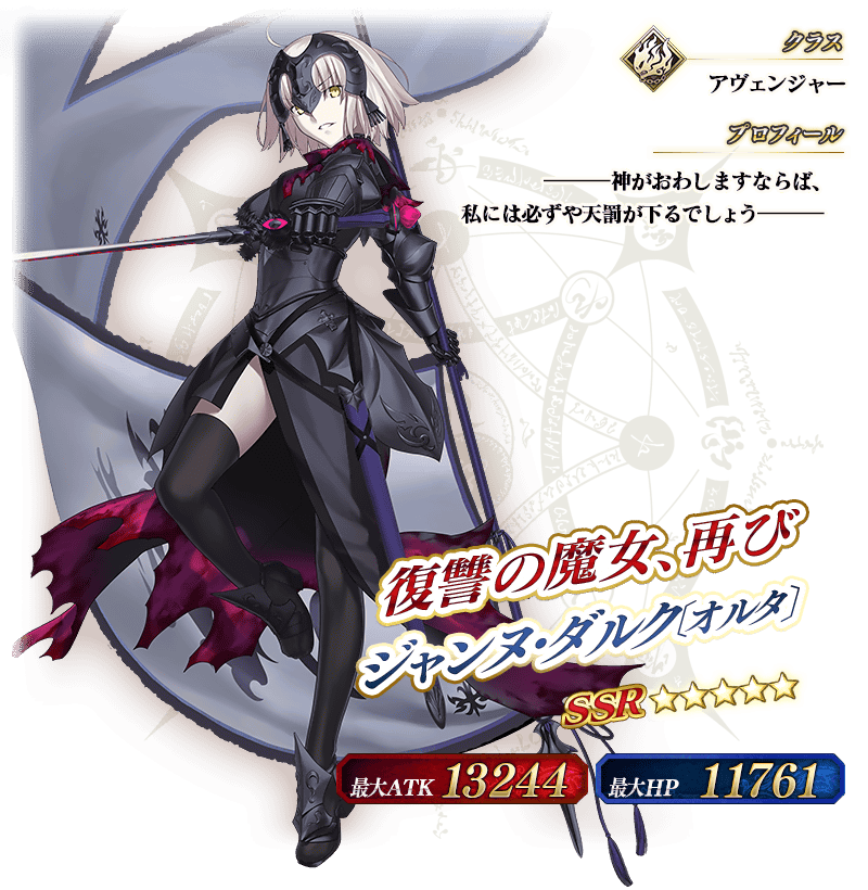 ※上記の「★5(SSR)ジャンヌ・ダルク〔オルタ〕(アヴェンジャー)」のイラストは霊基再臨第2段階のものです。