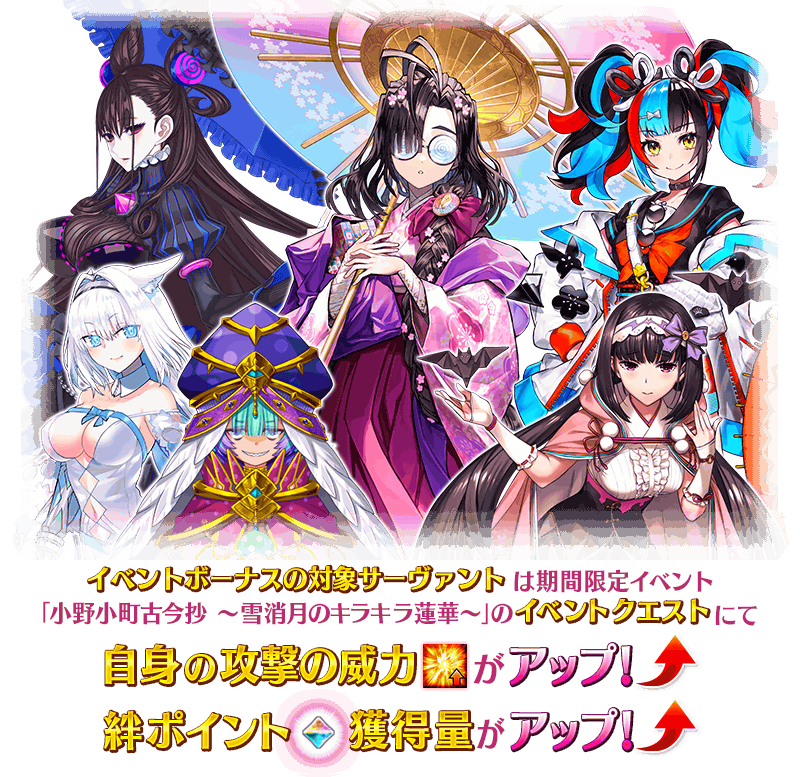 ※対象のサーヴァントとなっていても、本イベントのメインシナリオに登場しない場合があります。 ※イベントボーナスの効果量はサーヴァントによって異なります。 ※2月5日(水) 18:00より、サーヴァント選択画面やサーヴァント強化画面などに、イベントボーナスフィルターが追加されております。イベントで活躍するサーヴァントのみを表示する便利な機能となりますので、こちらもあわせてご活用ください。
