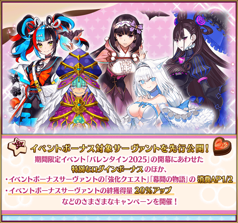 期間限定イベント「バレンタイン2025」の期間中、一部のサーヴァントはイベントクエストにおける「自身の攻撃の威力がアップ」と「絆ポイント獲得量がアップ」のボーナスを得られます!