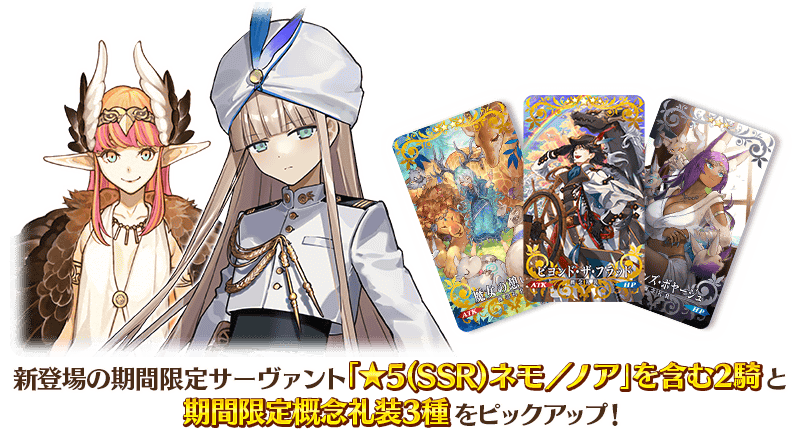 期間限定イベント「失われた創世(ヴァニッシュド・ビギニング) 未来からの方舟」の開幕を記念して、新登場の期間限定サーヴァント「★5(SSR)ネモ/ノア」を含む2騎と期間限定概念礼装3種をピックアップ!