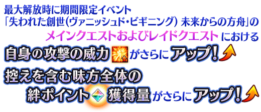 ピックアップ対象の期間限定概念礼装3種は、装備すると期間限定イベント「失われた創世(ヴァニッシュド・ビギニング) 未来からの方舟」のメインクエストおよびレイドクエストにおける自身の攻撃の威力がアップ&控えを含む味方全体の絆ポイント獲得量がアップします。