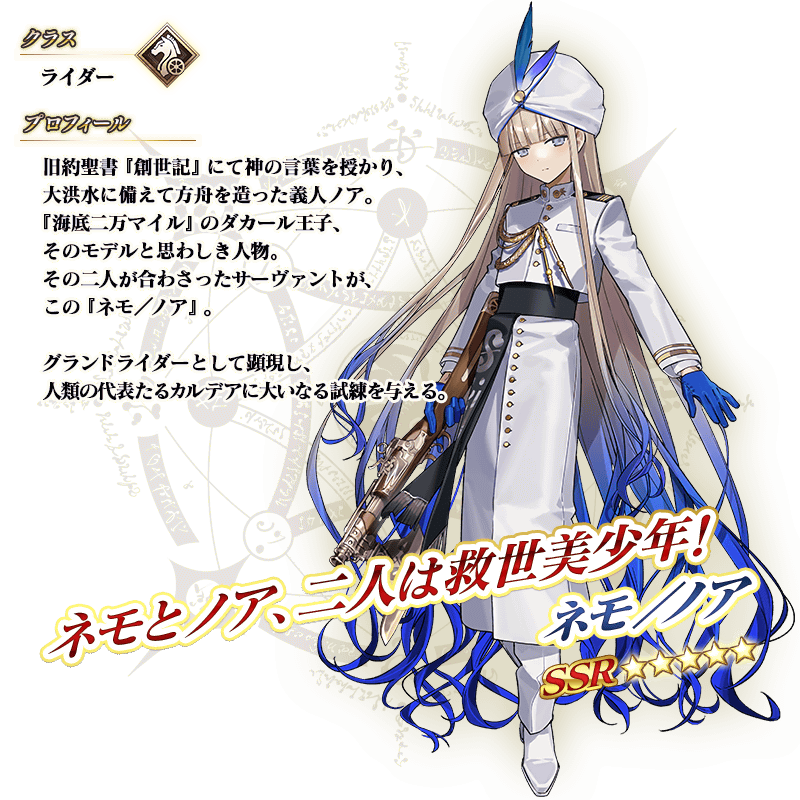 期間限定イベント「失われた創世(ヴァニッシュド・ビギニング) 未来からの方舟」の開幕を記念して、新登場の期間限定サーヴァント「★5(SSR)ネモ/ノア」を含む2騎と期間限定概念礼装3種をピックアップ!