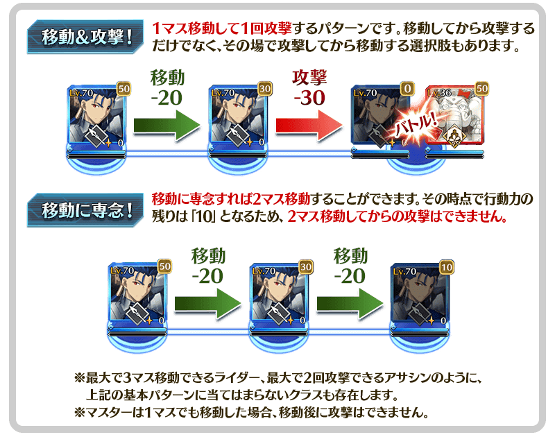 ほとんどのサーヴァントが移動時に「20」、攻撃時に「30」の行動力を消費するため、行動パターンは1マス移動&1回攻撃、2マス移動のどちらかとなりやすいということを覚えておくと、味方や敵の行動範囲を予測しやすくなります。