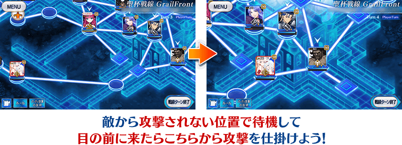 聖杯戦線では攻撃を仕掛けた側が先行して行動できるため、基本的に敵を待ち受けて、近づいてきたところをこちらから攻撃する戦い方が有効です。