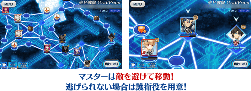 マップによっては敵を避けるのが難しいこともあるため、そういう場合は護衛役のサーヴァントをマスターの近くに配置し、マスターを守れるようにしましょう。