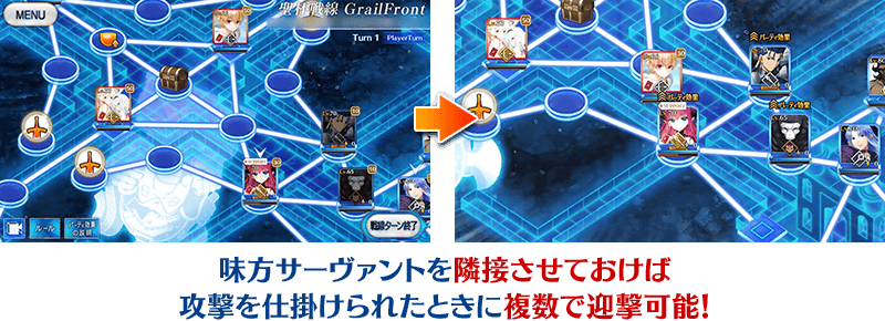 敵を迎え撃つ場合は、味方サーヴァント同士を隣接するように配置しておくことがポイントです。