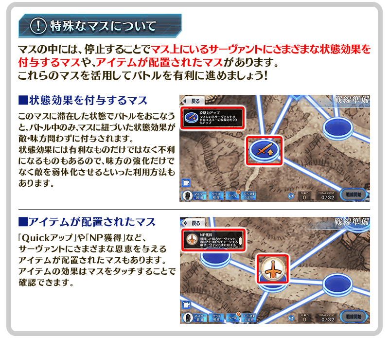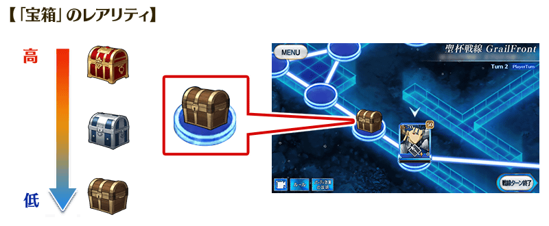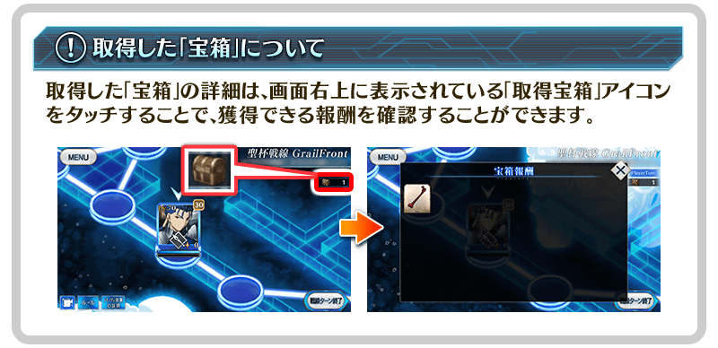 「宝箱」は、マスに味方サーヴァントおよびマスターが滞在することで取得でき、取得した「宝箱」の報酬は、クエストをクリアすることで獲得できます。