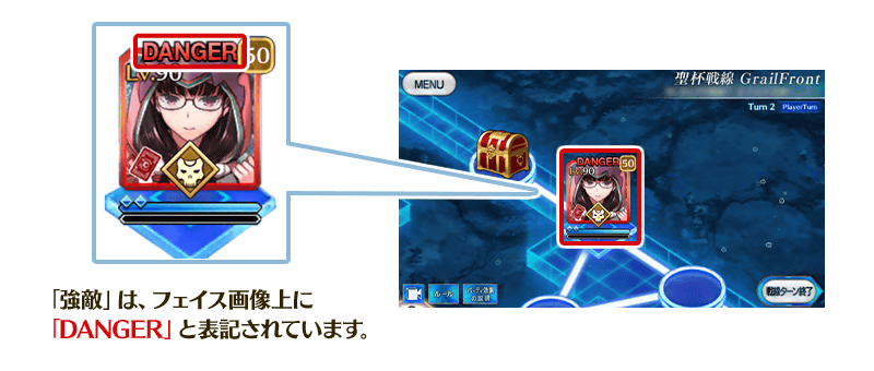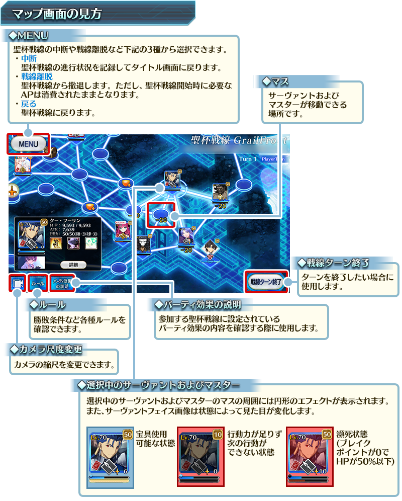 聖杯戦線のマップ画面では、マップ上のマスの内容や各サーヴァントおよびエネミーの状態などを確認できます。