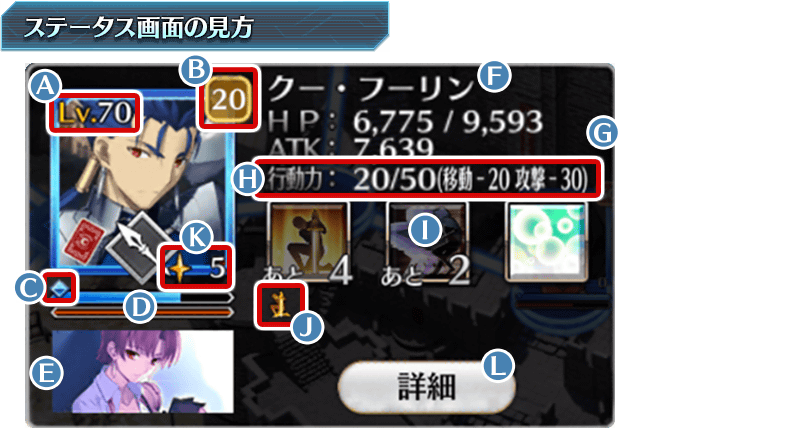 該当サーヴァントのより詳しいステータス、状態変化を確認することができます。