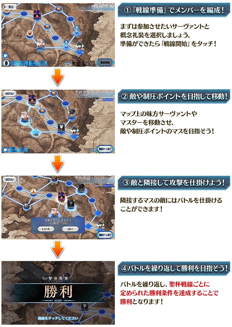専用のバトルフィールドでおこなわれる特殊な形式のバトル「聖杯戦線」の基本的な流れを紹介いたします。