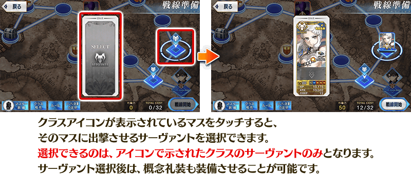 ※「戦線準備画面」において、サポートサーヴァント以外の味方サーヴァントが配置されていない状態で出撃することはできません。 ※サポートサーヴァントの概念礼装を変更することはできません。