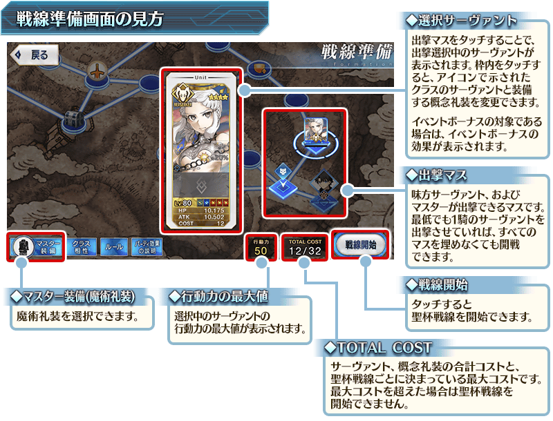聖杯戦線では、まず初めに「戦線準備画面」で、マスターの装備する魔術礼装や出撃するサーヴァントを選択します。聖杯戦線ごとにTOTAL COSTが決まっているため、コスト内に収まるよう編成しましょう。最低でも1騎のサーヴァントを出撃させていれば、すべての出撃マスを埋めなくても開戦できます。