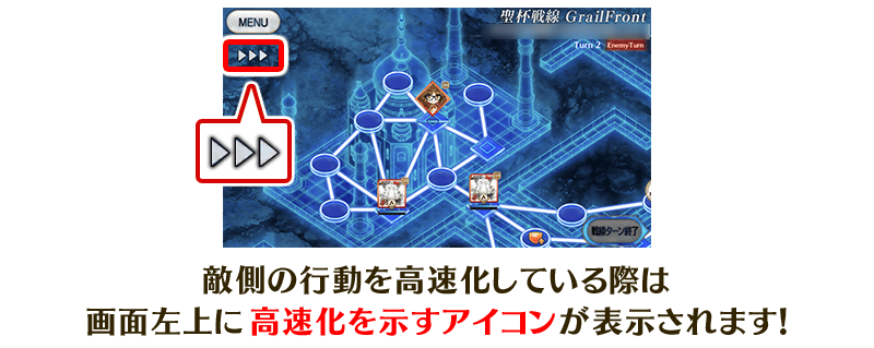 聖杯戦線のマップ画面において、Enemy turn中に画面をタッチすることで敵側の行動を高速化することができます。 ※マップ画面にメッセージが表示される場合は、一時的に通常の速度に戻ります。