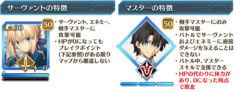 聖杯戦線はマップ上のサーヴァントとマスターを行動させて進めていきます。マップ上でできる行動は基本的に同じですが、サーヴァントとマスターで攻撃できる相手や勝敗に関わる条件など、それぞれ特徴が異なっています。
