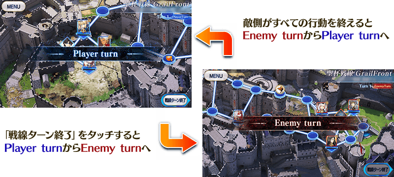 聖杯戦線では、味方がマップ上で行動できるPlayer turnと、敵側が行動するEnemy turnを交互に繰り返して進行していきます。