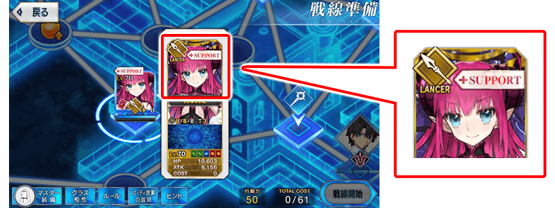 サポートサーヴァントはマップ上のフェイス画像やサーヴァント詳細画面において「+SUPPORT」と表示され、サポートサーヴァントの編成コストはTOTAL COSTに含まれません。