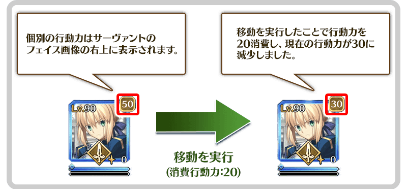 聖杯戦線中に攻撃や移動といった行動をおこなう際、または行動不能状態から回復する際は、マスターやサーヴァント、エネミーがそれぞれ個別に有している行動力を消費します。行動する際の消費行動力はクラスごとに異なり、マスターは固有の値となります。 ※行動不能状態からの回復についての詳細はこちら。