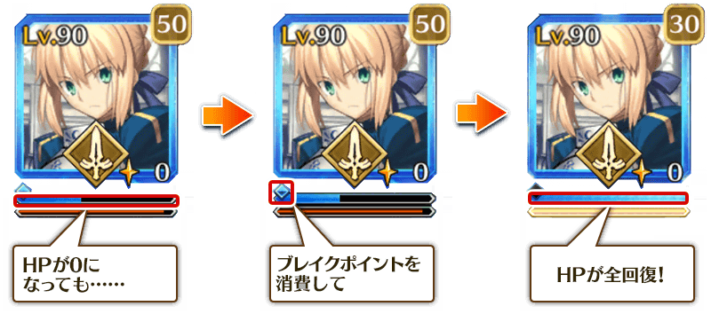 聖杯戦線のバトルでは、サーヴァントおよびエネミーのHPが0になった時に消費されるブレイクポイントが存在します。
